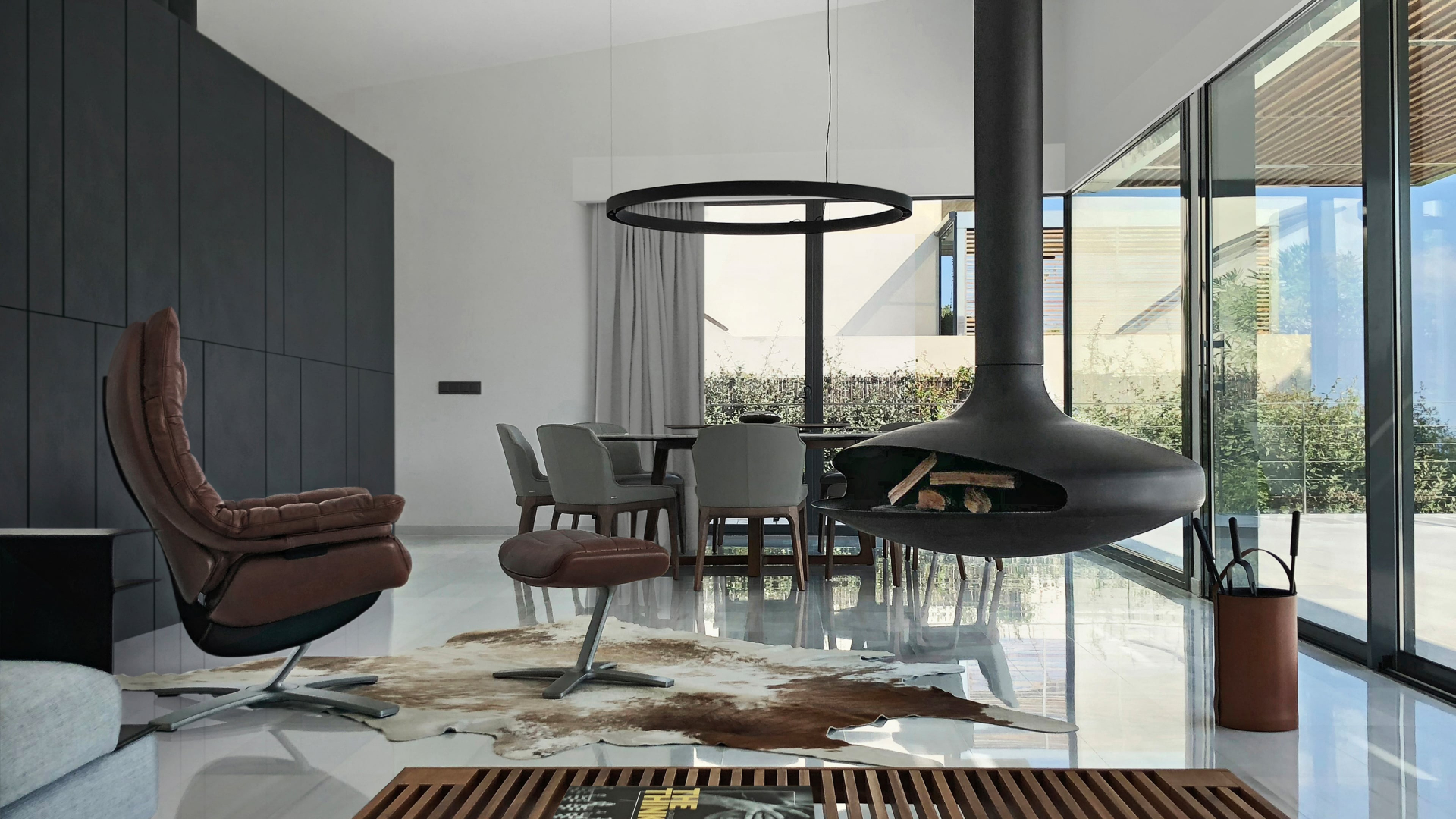 Мы не боимся острых углов и не смягчаем их, если этого не требует «картина». Но мы стараемся сделать так, чтобы, находясь дома, ощущалось тепло натурального дерева, легкая прохлада и запах настоящей кожи. В камине потрескивали дрова, и звучал теплый звук стереосистемы.